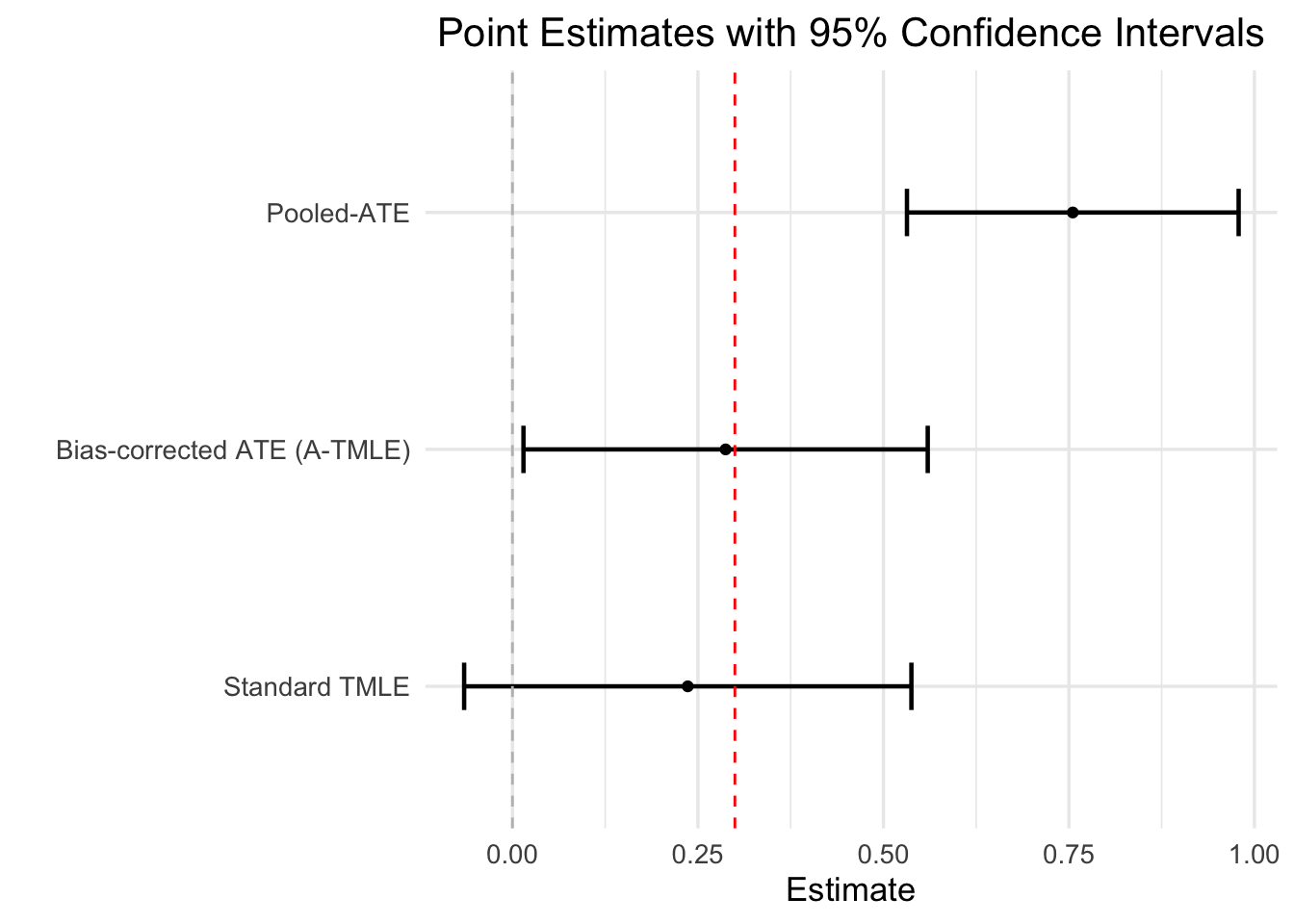 First, let’s examine the point estimates. The pooled ATE estimate is 0.76, while the bias-correct ATE estimate is 0.29 We also see that the estimate of the bias is 0.47 Indeed, the bias correction is pushing us closer to the truth, which is 0.30.