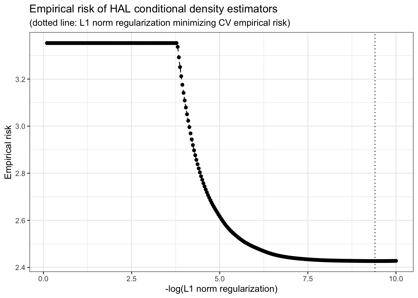 The package implements the nonparametric conditional density estimation via pooled logistic regressions using HAL, as discussed above .